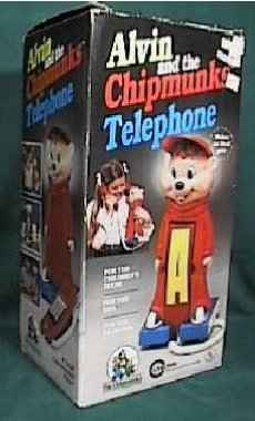 Copyright 1984 Bagdasarian Productions. Licensed by Mode Pictures Inc., N.Y. N.Y. Measures 15 inches tall x 6-1/2 inches wide x 6 inches deep. Stickers on both sides of the base say 'Alvin & The Chipmunks'. The handset is part of Alvin's body and has a large yellow 'A' sticker on it. The handset has pushbuttons including Mute and Redial, and also has a Ringer on/off switch. There is also a tone/pulse dialing switch.It hangs up when the handset is put back into Alvin. Made in Hong Kong for Bagdasarian Productions. |