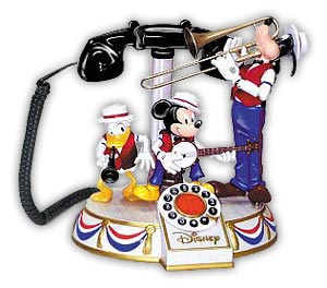 DISNEY`S DIXIELAND BAND ANIMATED TELEPHONE, by Telemania. Officially licensed Walt Disney multi-character telephone depicting a scene right out of Walt Disney`s dixieland parade. The animation features Mickey Mouse playing the banjo and stomping his foot to the beat. Goofy is playing slide trombone, almost hitting the clarinet playing Donald Duck in the head. Features switchable ringer(conventional or animated), Last number redial, Volume control, Demonstration button, Hearing aid compatible. |
